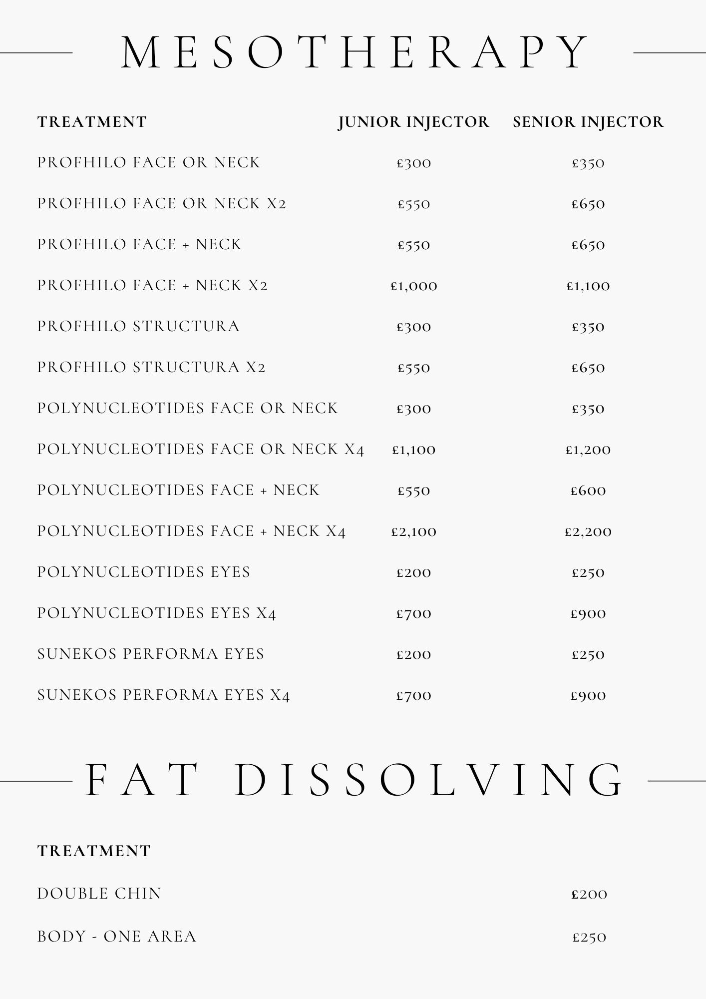 Price list for microneedling, chemical peel and exosomes.